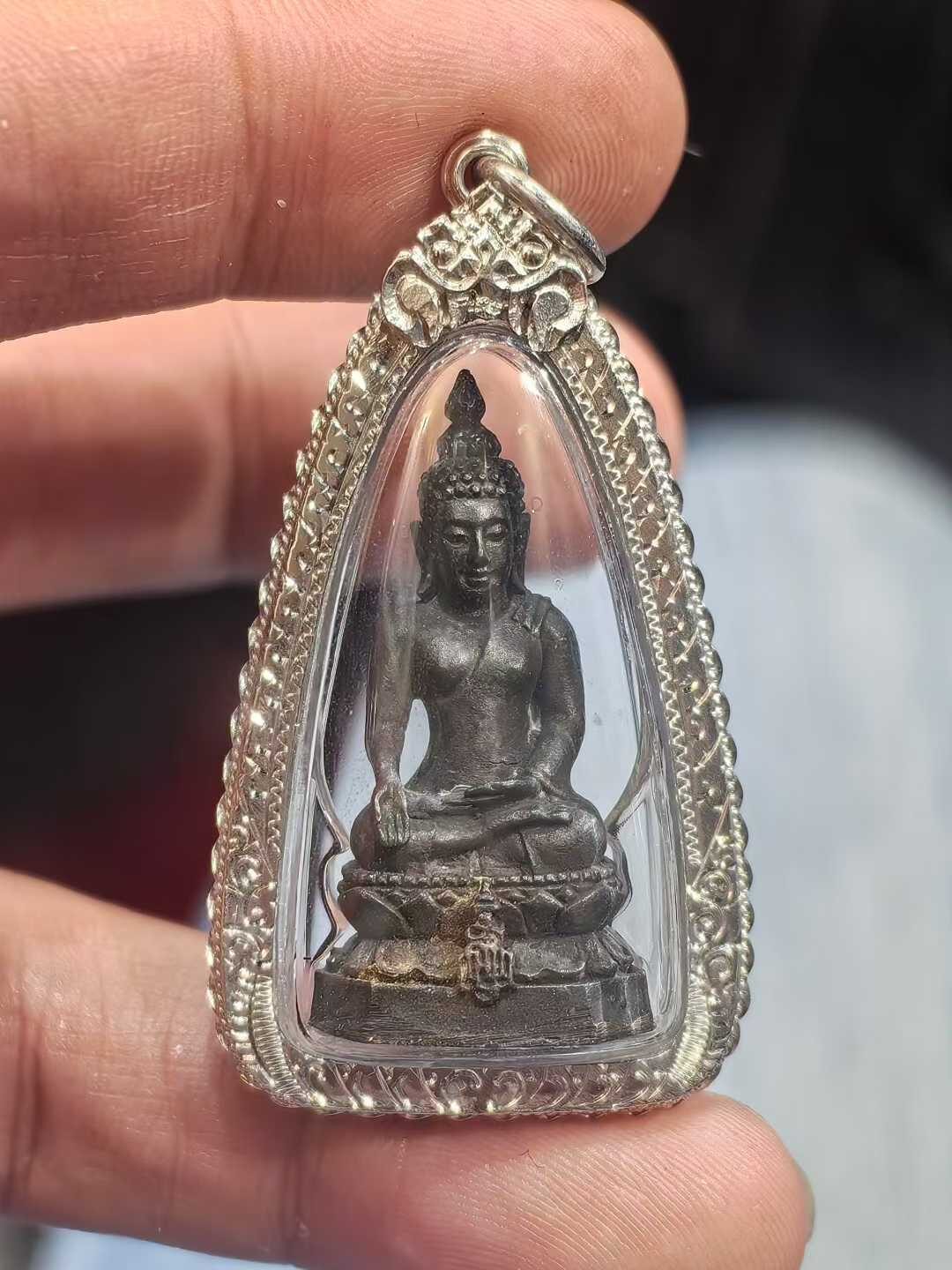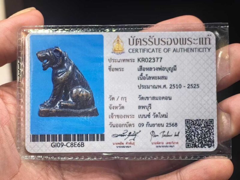 龍婆伴Me開光的古董鑄造老虎佛牌,出自屈考十磨con。這尊鑄造老虎佛牌被認為是龍婆伴Me最著名的佛牌之一。可以說,在華富裡府,鑄造虎王佛牌的寺廟以其強大的功效而聞名。這尊虎王是龍婆伴Me從他的師傅,另一位著名高僧,屈考十磨con的帕烏帕查里孔那裡繼承而來的。這尊虎王由銅與各種符管和金屬溶合製成。因此,它的顏色類似於九寶銅,底部打有印記。