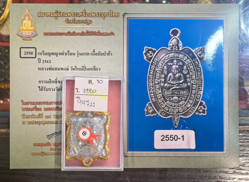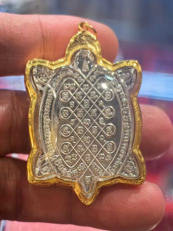 早幾年前當時泰國突然興起財龜佛牌,很多不同的僧人都開光形態像龍婆了的財龜,當時理事們與善信們都建議師傅,希望師傅能夠開光一款真正龍婆了法門而又能真正幫助信眾的財龜,可惜師傅依然都是拒絕了。之後某天晚上師傅龍婆崇碰休息時,竟然夢見了恩師龍婆了,龍婆了特意來找師傅並在夢中千叮萬囑龍婆崇碰一定要在2562開光一期財龜的佛牌幫助善信們,亦說只要開光一期就足夠了,之後不需再開光財龜。師傅醒來之後就一切如常,並沒有將此事告訴任何人。大概3至5天左右突然有位經常到廟探望師傅的善信來探望師傅時,請求師傅很希望協助師傅鑄造一批財龜佛牌。既然恩師龍婆了在夢中叮囑,剛好又有信眾主動協助,師傅就親決定開光第一期財龜。而財龜造型方面,因為很多年前龍婆了開光完非常知名的第一期波力(永不負債)財龜,當時就親自送了一塊給愛徒龍婆崇碰,而這塊波力財龜龍婆崇碰接過後就一直放左口袋裡長期跟身這麼多年,所以師傅就決定造型跟這塊龍婆了第一期波力一模一樣。