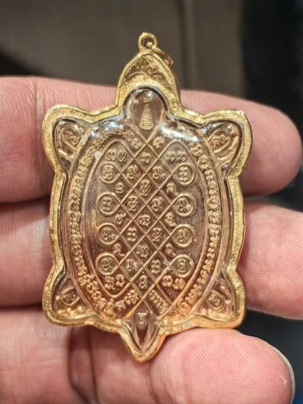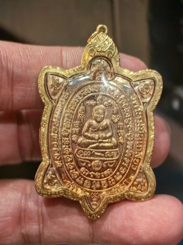 早幾年前當時泰國突然興起財龜佛牌,很多不同的僧人都開光形態像龍婆了的財龜,當時理事們與善信們都建議師傅,希望師傅能夠開光一款真正龍婆了法門而又能真正幫助信眾的財龜,可惜師傅依然都是拒絕了。之後某天晚上師傅龍婆崇碰休息時,竟然夢見了恩師龍婆了,龍婆了特意來找師傅並在夢中千叮萬囑龍婆崇碰一定要在2562開光一期財龜的佛牌幫助善信們,亦說只要開光一期就足夠了,之後不需再開光財龜。師傅醒來之後就一切如常,並沒有將此事告訴任何人。大概3至5天左右突然有位經常到廟探望師傅的善信來探望師傅時,請求師傅很希望協助師傅鑄造一批財龜佛牌。既然恩師龍婆了在夢中叮囑,剛好又有信眾主動協助,師傅就親決定開光第一期財龜。而財龜造型方面,因為很多年前龍婆了開光完非常知名的第一期波力(永不負債)財龜,當時就親自送了一塊給愛徒龍婆崇碰,而這塊波力財龜龍婆崇碰接過後就一直放左口袋裡長期跟身這麼多年,所以師傅就決定造型跟這塊龍婆了第一期波力一模一樣。
